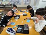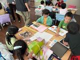 4年生は、初めて木版画に取り組みます。真新しい彫刻刀が光っています。安全に取り組む注意を確認して、三角刀、丸刀、切り出し刀の使い方を先生のデモンストレーションで確認しました。