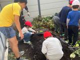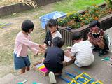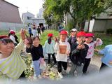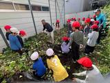 2年生が植えたさつまいもが大きくなっていると聞いて、今日はいもほりをしました。軍手をはめて、赤白帽子をきりりとかぶって、「早く、大きなさつまいもを取りたいよ。」と意気込み、畑に向かいました。野菜作り名人の林さんのレクチャーを聞き、早速、いもほりに夢中になりました。「つるを伝って行くとさつまいもがついているよ。」「つるが切れても土の中にさつまいもがあるから、シャベルや手で、よく探すんだ。」声をかけ合い、力を合わせて、いもを掘り出していきます。