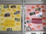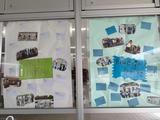 ピロティから見えるのは、選抜リレーの各チームの紹介ポスターです。赤「レッド ウォーリアーズ」、黄色「イエロー チーターズ」、白「ホワイト ニンジャーズ」、青「ブルー シャークズ」と、仲間で名前を決めました。意気込みも書いてあります。自分たちで一秒でも速くするためにどうしたらよいか考えているので、バトンパスが上手になりました。当日を楽しみにしていてください。