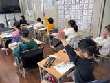 1年生の教室に行くと、算数の学習をしていました。よい姿勢で文章問題をノートに書き終えました。問題を書き写す時間が速くなっていて驚きました。筆箱や教科書、ノートを置く位置が定位置となっていて、学習のルールがしっかり身についていることがわかりました。今日の問題は、「おりがみを24まいもっています。3まいもらいました。ぜんぶでなんまいですか。」です。量感を確かめるため、半具体物(ブロック)を使い、24を確かめます。十のかたまりが2つとバラ4となります。3まいもらうというのは?「ふえる!」「たし算。」「そうだね。どこにふえる?」「バラの所にふえる。」そのようなやりとりがありました。どうしてそうなるのか説明ができるように、周りの人とも話し合いをしています。その後、式や答えを書き、問題を解き終えました。そろそろ2年生の姿を意識し始めた1年生です。1年間の成長に驚かされる毎日です。