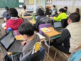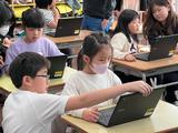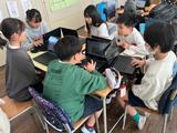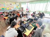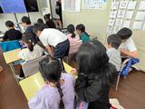 モジュールの時間に、1年生がGIGA端末の「キーボー島」をするために、6年生が教えに来てくれました。1年生は、GIGA端末を準備してソワソワしていました。6年生が来ると、ペアになり、優しくわかりやすく教えてくれました。1年生は、6年生を尊敬の眼差しで見ています。それだけ6年生は、すごく頼りになるのです。「キーボー島」のアプリをお気に入りに入れて、アプリを開いたり、キャラクターの設定をしたり、上手に教えてくれるので、1年生もすぐに、覚えられました。一緒に設定が終わると、シャットダウンして、1年生が一人でできるか見守っています。これで、タイピングの練習が楽しくできるようになりました。1年生に6年生が優しく寄り添っている光景が輝いて見えました。素敵でした!
