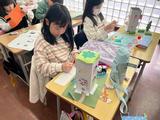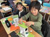 窓を作って開けたら何が見えるのか想像して、自分だけのオリジナルの建物を作りました。ここでは、「カッター」の使い方を学びながら作品を作っていきます。カッターとカッター板を使って、四角い窓や丸いアーチの窓、三角の窓など、好きな形に窓を切り抜いていました。ギザギザの屋根を切り抜いている子もいました。建物を立てて、窓を開けると好きなものが見えるように、絵をかいて、後ろから貼っていきます。女の子やシマエナガ、ピカチュウ、サクランボ、怪獣も見えます。どの子も夢中になって、絵を書き足したり、色紙を切り抜いたりしていました。学習は終盤になり、建物の周りを飾っている子もいます。「ここに付けたらいいんじゃない。」「うん。いい感じ。」と周りの人に話しかけたり、独り言を言ったりしています。素敵な建物ができあがりそうです。授業参観の折にでも見てくださいね。