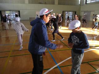 そのめあてを達成できる遊びを考え、体育館のラインの上で鬼ごっこをする「あみだおにごっこ」に決めました。