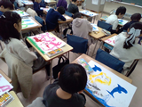 図工「たのしくうつして」の学習で初めて版画に挑戦しました。自分で作った型紙を何度も使って表すことでどんどん作品が変化していくことを楽しみました。ローラーやスポンジといった道具を使いながら、型紙を置く位置や色などを考えて形を表すことができました。