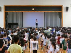 夏休みまでのそれぞれのがんばりをふり返り、こども110番や、年間スローガン、夏休みのすごし方の話を聞きました。