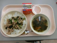 参加者で配膳を行い、「豚肉ともやしのオイスター丼・わかめとコーンのスープ・川崎育ちの梨ゼリー」を試食したあとは、子どもたちの給食の様子を見学しました。