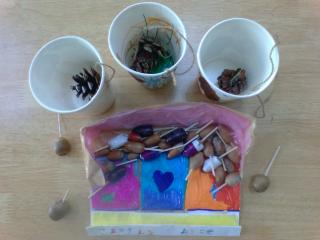 1年生がドングリで作ったおもちゃはどれも好評で、園児は楽しそうに遊んでいました。