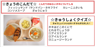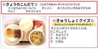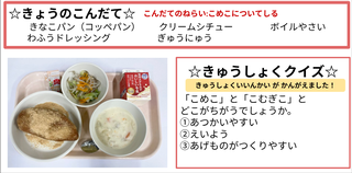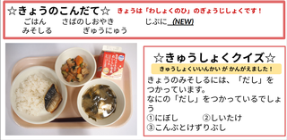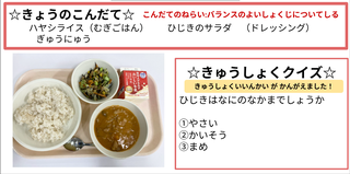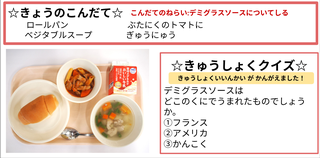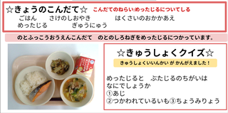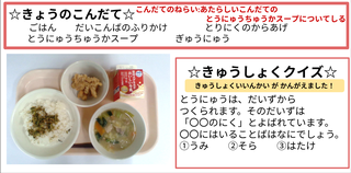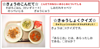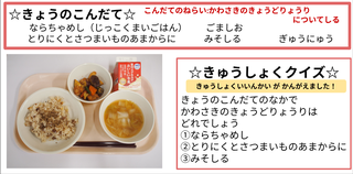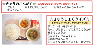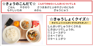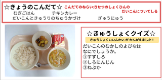 ★給食時間にはその日の給食にちなんだクイズを出しています。今日は給食委員会の児童が考えたクイズでです。答えはお子様に確認ください。