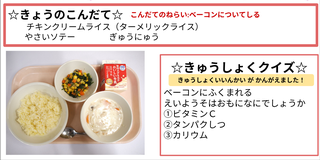 今日の献立は、チキンクリームライス(ターメリックライス)・野菜ソテー・牛乳です。献立のねらいは「ベーコンについて知る」です。ベーコンは豚肉から作られます。肉に塩などをつけて長い時間燻したり、茹でて作ります。この作業を燻製といい、昔から長い時間腐りにくくする方法として作られてきました。