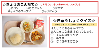 今日の献立は白パン・いちごジャム・ラザニア・キャベツのスープ煮・牛乳です。献立のねらいは「キャベツについて知る」です。キャベツは季節に合わせた品種がつくらて1年中出荷されています。寒い時期のキャベツは葉がぎゅっとしまっていて煮込むことで柔らかくなり甘くなるのが特徴です。キャベツが日本で食べられるようになったのは今から120年前の明治時代からです。