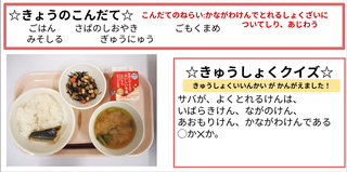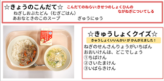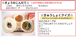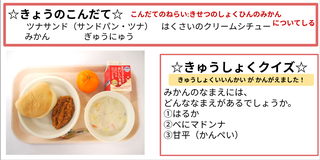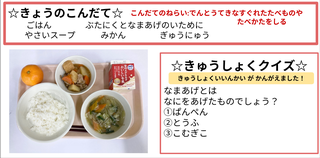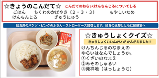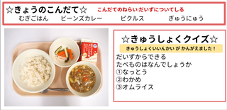 ★給食時間にはその日の給食にちなんだクイズを出しています。今日は給食委員会の児童が考えたクイズでです。答えはお子様に確認ください。
