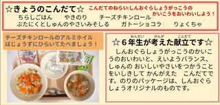 今日の献立は、ちらしごはん(ごはん)・焼きのり(オリジナルパッケージ)・チーズチキンロール・豚肉と旬の野菜みそ汁・ガトーショコラ・緑茶です。献立のねらいは「新小倉小学校の開校をお祝いしよう!」です。今日の献立は、明日の新小倉小学校の開校記念のお祝いとして、私達6年生が家庭科の学習で献立を考えました。献立をたてるポイントの栄養バランス、旬の食材を使うことそして、新小倉小のお祝いとしてみんなが楽しくおいしく食べられるように考えました。チーズチキンロールは給食室で調理員さんが、1つ1つ給食室でチーズとにんじんをとり肉で巻いて作りました。にんじんの赤とチーズの白の紅白でお祝いも意識しています。のりのパッケージデザインは新小倉小オリジナルのものです。おいしく楽しく食べて明日式典が素敵なものになりますように。