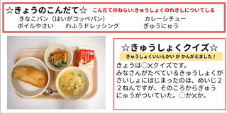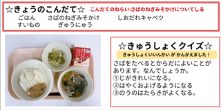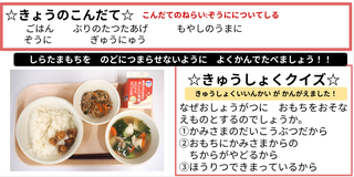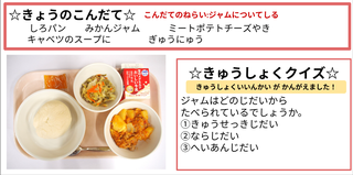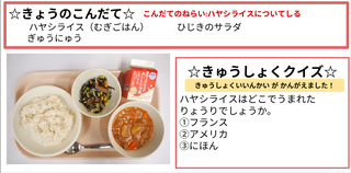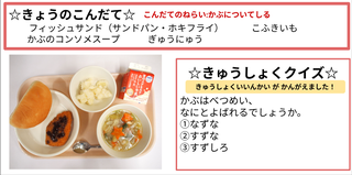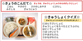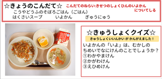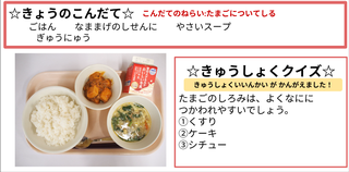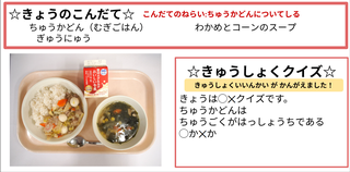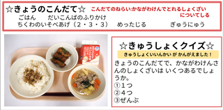★給食時間にはその日の給食にちなんだクイズを出しています。今日は給食委員会の児童が考えたクイズです。答えはお子様に確認ください。