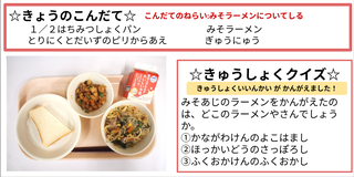 1/2はちみつロールパン・みそラーメン・とり肉と大豆のピリ辛あえ。牛乳です。献立のねらいは「みそラーメンについて知る」です。みそは大豆を加工した発酵食品です。発酵食品は体を温める効果があります。みそラーメンは、北海道札幌市のラーメン店で考えられたそうです。中華料理を参考に何年もかけて作り上げられたといわれています。