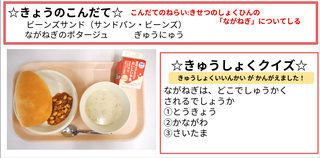 今日の献立は、ビーンズサンド(サンドパン・ビーンズ)・長ねぎのポタージュ・牛乳です。献立のねらいは「季節の食品の長ねぎについて知る」です。長ねぎは緑色の硬い部分と、白い柔らかい部分があります。日光に当たると硬く緑色に育つため、白い部分は土をかぶせて育てます。長ねぎは生のまま食べると少し辛いですが、煮込むと甘くとろりとした食感になります。長ねぎには体を元気にしたり、病気を防いだりする働きのある栄養素が含まれています。長ねぎのポタージュは長ねぎをたくさん使ってよく煮込んで作っています。