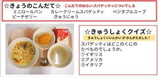 今日の献立はミニロールパン・カレークリームスパゲッティ・ベジタブルスープ・ピーチゼリー・牛乳です。献立のねらいは「スパゲッティについて知る」です。スパゲッティはイタリア生まれの食品で、「パスタ」の仲間の一つです。イタリア語では「ひも」と呼ばれ、太さによって様々な種類の呼ばれ方をしています。給食で使われるスパゲッティは、同じ太さのスパゲッティを使っていますが、通常よりも短いスパゲッティを使っています。