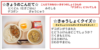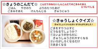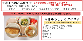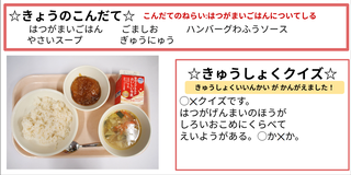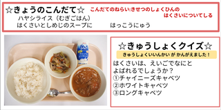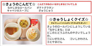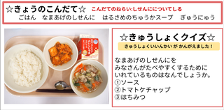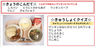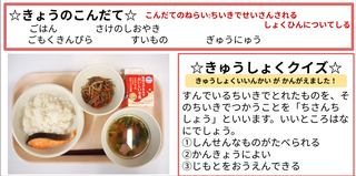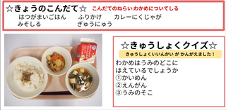 ★給食時間にはその日の給食にちなんだクイズを出しています。今日は給食委員会の児童が考えたクイズです。答えはお子様に確認ください。