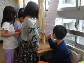 生活科の「うごくうごく わたしのおもちゃ」の学習では、身近にある物を材料にして、動くおもちゃを作りました。自分の作ったおもちゃで遊んだり、同じおもちゃを作った友だちと一緒に遊んだりするなかで、「みんなで遊びたい」という思いが高まり、学年全員参加のおもちゃ会を開催することになりました。楽しく遊ぶための遊び方やルールを決めるなど、同じグループの友だちと協力してしっかりと準備を行いました。学習を通して、みんなと遊びを創り出すことの面白さを実感していました。