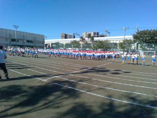 秋晴れのもと、運動会全体練習を行いました。初めての全体練習。6年生の鼓笛隊のリードのもと進められました。