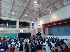 5人の演奏家の方の演奏を聴きました。ピアノ、オーボエ、チェロ、バイオリンの楽器と声楽家の方の美しい音色でした。静まり返った体育館に美しい音色が響き、子どもたちは知っている曲ばかりだったので口ずさみたくなった子もいたようですが、静かに聴き入っていました。