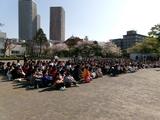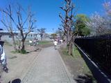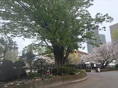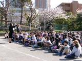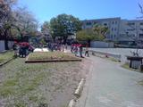 学校横のニケ領用水沿いの桜は満開で、この週末桜を楽しむ人たちがたくさんいました。学校内も桜やチューリップなどの花が咲き、子どもたちが登校してくるのを待っているかのようです。子どもたちがいない学校は、カモが自由気ままに歩き回っていました。