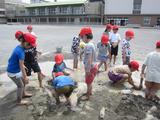 6月中旬頃に、図工「すなとつちとなかよし」の学習をしました。とても暑い日だったので、水を使いながら砂を泥にして全身泥だらけになりながら楽しみました。泥団子を作っている子、トンネルや池を作っている子、土がドロドロして体につけるとひんやりすると発見している子など、自分なりに遊び方を見つけて楽しむ様子が見られました。どの子も大満足だったようで「楽しかった!!」という声が多かったです。