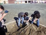 【5年生】理科 流れる水の働きを確かめるために、砂場で水を流しました。あとで確認できるように、GIGA端末で写真や動画を撮っていました。