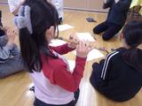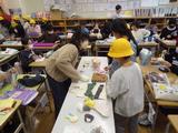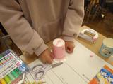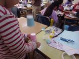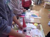 図工「とびだせ ぴょーん」 輪ゴムをつけた紙コップを重ねて、ゴムの力で飛ばす作品を作っています。ロケットやウサギなど、思い思いの作品を作り、紹介してくれました。動きが速すぎて、飛んでいる瞬間は写真に撮れませんでした。