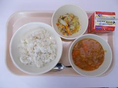 今日の給食は「ハヤシライス(麦ごはん)、白菜としめじのスープ煮、牛乳」