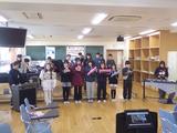 【朝会】今日は音楽朝会でした。音楽委員の皆さんの演奏にあわせて、各教室で「ビリーブ」を歌いました。