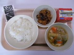 今日の給食は「ごはん、焼きのり、ぶりのつけ揚げ、のっぺい汁(宮内そだちの小松菜いり)、牛乳」