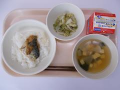 今日の給食は「ごはん、さばのねぎみそかけ、塩だれキャベツ、吸い物、牛乳」