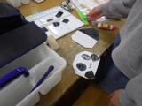 図工 昨日とは違うクラスでものこぎりを使っていました。切った木材に絵の具を塗って組み立てていきます。