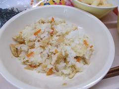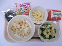 今日の給食は「ちらしごはん(ごはん)、きざみのり、いかの吉野揚げ、やよい汁、ひなあられ、牛乳」