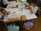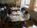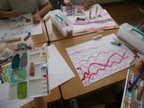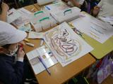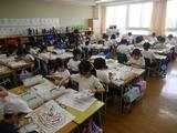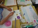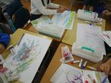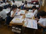 図工 「絵の具+水+ふで」 絵の具セットの使い方や片付け方を分かりやすく掲示して取り組んでいました。水の量を調節して、同じ色でも濃さを変えながら描いていました。