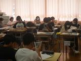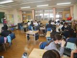 理科 集気瓶の中でろうそくの火を燃え続けさせるためにはどうしたらよいかをみんなで考えています。今日は、空気の流れが関係あると考え、その流れをどうやって見えるようにするかを話し合っていました。