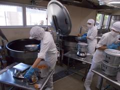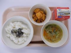 今日の給食は「ごはん、ごま塩、生揚げの四川煮(レバーチップ)、野菜スープ、牛乳」