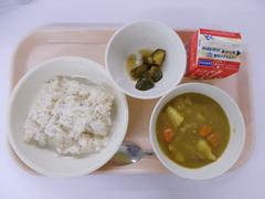 今日の給食は「麦ごはん、ポークカレー、きゅうりの中華づけ、牛乳」