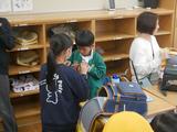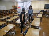 今日も1年生の教室で、給食の片付けや清掃の手伝いをしました。自然に1年生と目の高さに合わせて手伝いやお話をする姿があちこちで見られます。