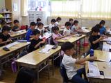 【1年生】国語 ひらがなやかたかなに続いて、漢字の学習をしています。今日は「一」と「二」を丁寧に書いていました。