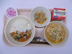 今日の給食は「ミニとり丼(ごはん)、ニュータンタンメン、もやしの中華風炒め、ぶどうゼリー、牛乳」