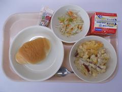今日の給食は「ロールパン、さつま芋のグラタン、ボイル野菜、和風ドレッシング、牛乳」