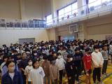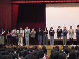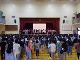 【朝会】今日は音楽朝会でした。音楽委員と先生たちの演奏に合わせて、全校児童が「花は咲く」を歌いました。