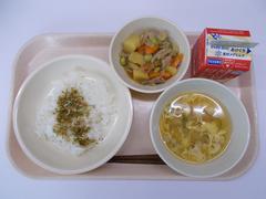 今日の給食は「ごはん、ふりかけ、肉じゃが、かきたま汁、牛乳」