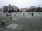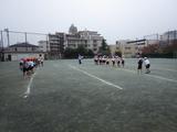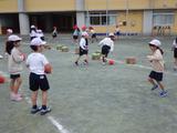体育 赤と白に分かれて、間に並んだ箱を相手側に押し込めるようにボールを蹴っていました。