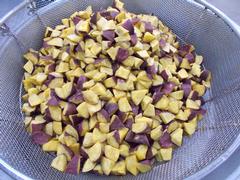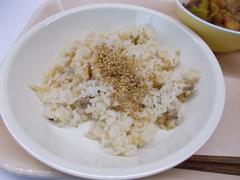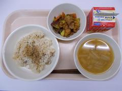 今日の給食は「なら茶めし(十穀米ごはん)、ごま塩、とり肉とさつまいもの甘辛煮、みそ汁、牛乳」