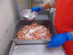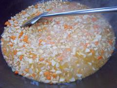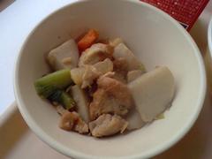 今日はとり肉に片栗粉をまぶして出汁をきかせた煮汁で煮ています。季節の野菜の大根や里芋を使っています。
