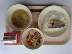今日の給食は「ごはん、さばの塩焼き、治部煮(じぶに)、みそ汁、牛乳」