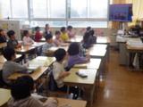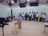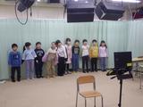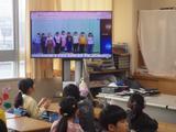 【朝会】今日は2年生の発表と運営委員会、緑化委員会からのお知らせがありました。2年生の代表児童が学習発表会で歌った歌を披露すると、教室のテレビで見ていた2年生も元気に歌っていました。