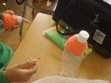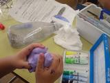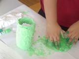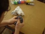 【図工】紙粘土を空き容器に貼り付けて小物入れを作ります。紙粘土に絵の具を練り込んで、好きな色を作ったりイメージを膨らませたりして、思い思いの作品を作っています。